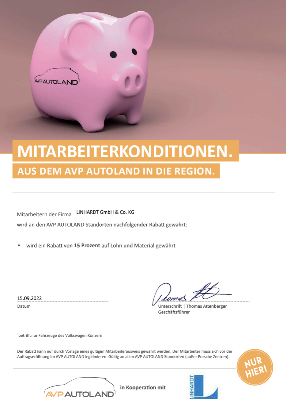 Ein neues Auto wird benötigt? Als LINHARDT-Mitarbeiter (m/w/d) erhaltet ihr ab sofort auf ausgewählte Markenfahrzeuge einen Rabatt zwischen 12%-17%. Gültig nur bei Leasing- und Neufahrzeuge! Alle Exklusivnachlässe sind über die Autohäuser Griesbeck (Volvo) und / oder AVP standortübergreifend nutzbar.