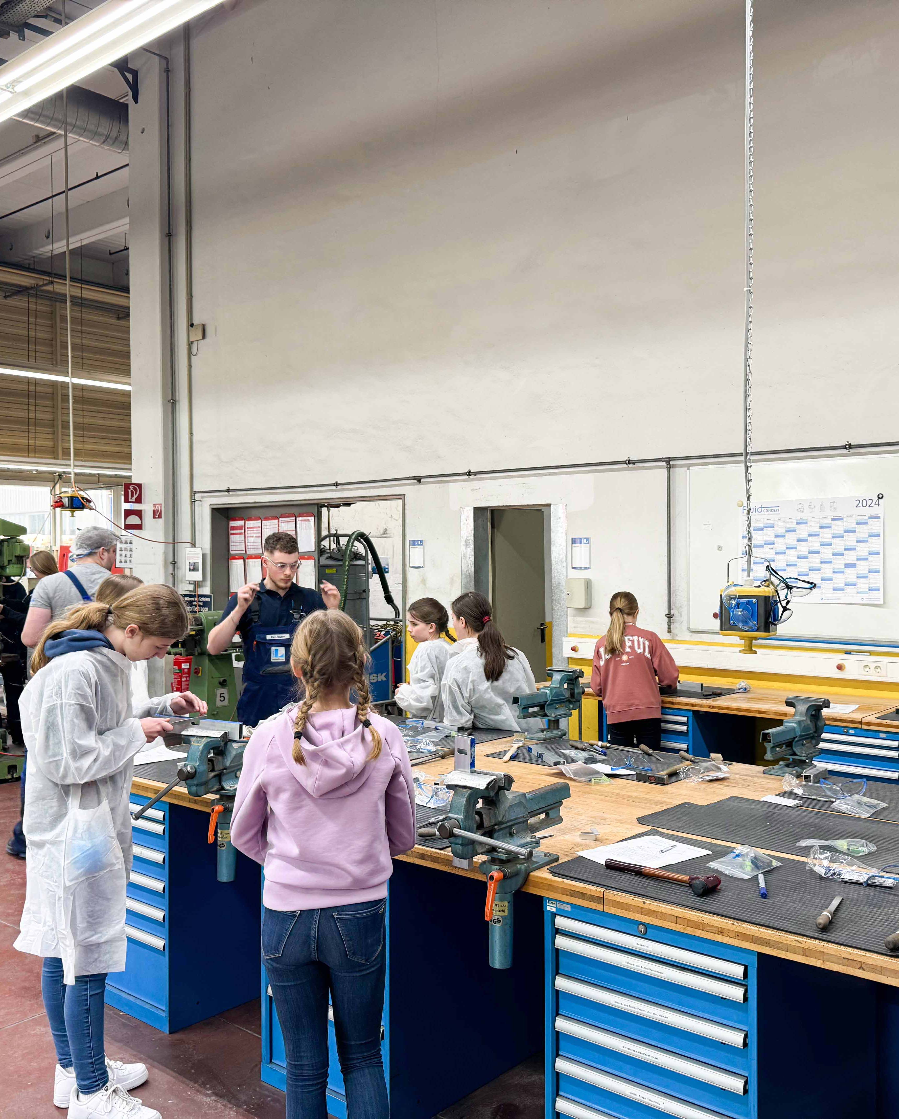 Hambrücken – Auch in unserem Werk in Baden-Württemberg durften elf Mädchen im Alter von 10 bis 15 Jahren in die faszinierende Welt der Technik eintauchen. Zu Beginn hatten die Mädchen die Gelegenheit, ihre handwerklichen Fähigkeiten unter Beweis zu stellen, indem sie ihre eigenen Wasserwaagen herstellten. Mit Schutzbrillen und Werkzeugen ausgerüstet, lernten sie die verschiedenen Schritte des Produktionsprozesses kennen und waren stolz auf ihre selbst gefertigten Werkstücke. Mit ihren passend zum Girls Day gestalteten T-Shirts, die sie in unserer Druckvorstufe kreierten, ging ihr Tag voller spannender Entdeckungen weiter. In diesem Workshop lernten die Mädchen die Grundlagen des Siebdrucks kennen. Ein weiterer Höhepunkt des Tages war, wie in Viechtach auch, der Firmenrundgang, bei dem die Mädchen einen Einblick in die verschiedenen Bereiche unseres Unternehmens erhielten. Von der Produktionshalle bis hin zu den Büroräumen konnten sie hinter die Kulissen blicken und erfahren, wie unsere Produkte hergestellt werden.