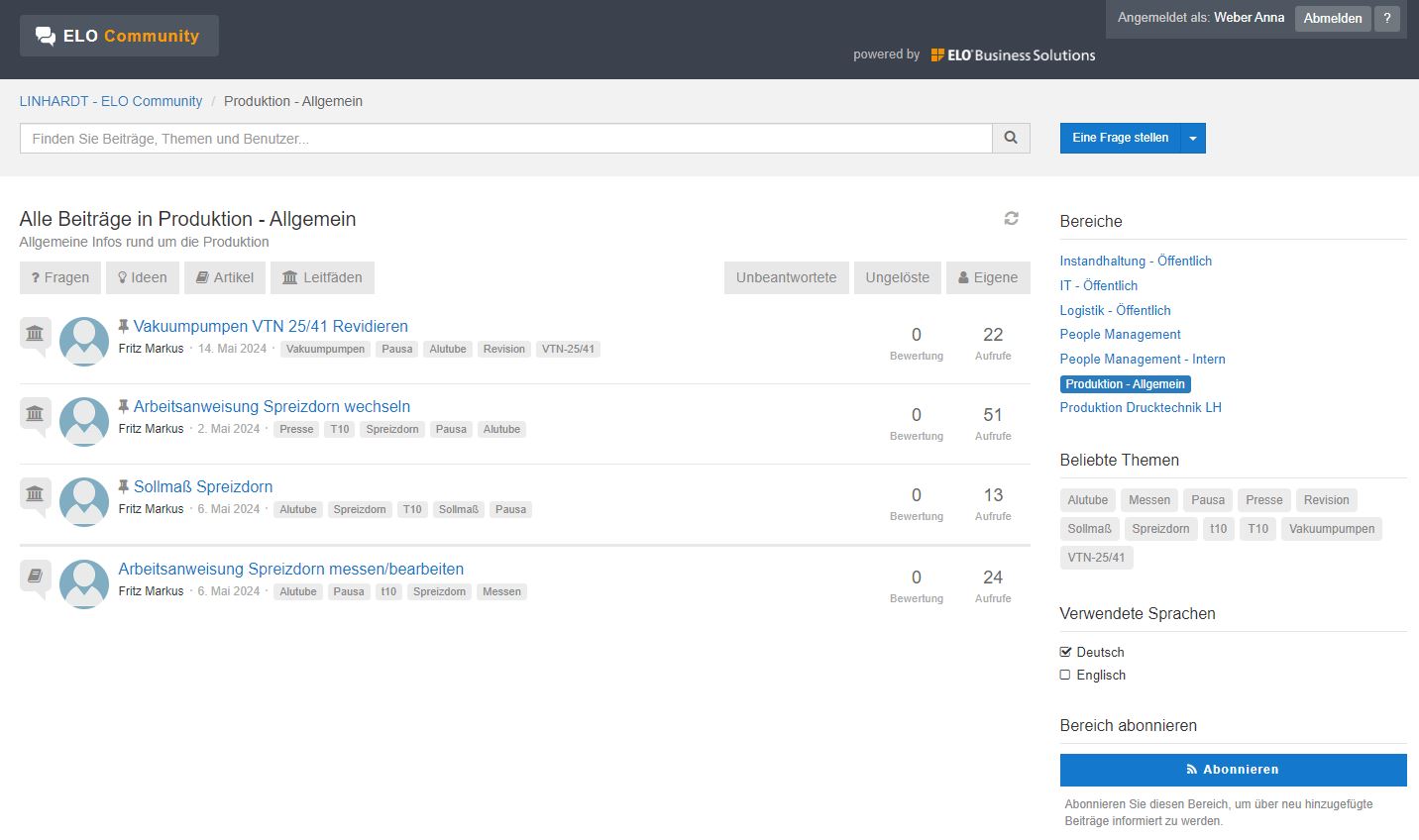 Für vier Themen wurden bebilderte Anleitungen in Form von Arbeitsanweisungen erstellt und im Anschluss in der ELO Wissensdatenbank hinterlegt. Die Zusammenstellung aller Aufgaben der Bediener wurde weiterentwickelt und wird gerade in Form gebracht.