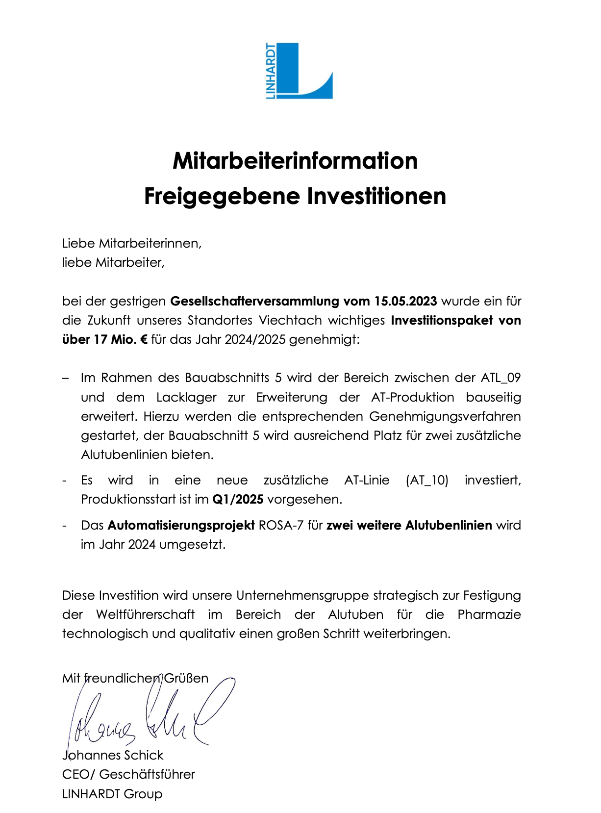 Mitarbeiterinformation – Freigegebene Investitionen