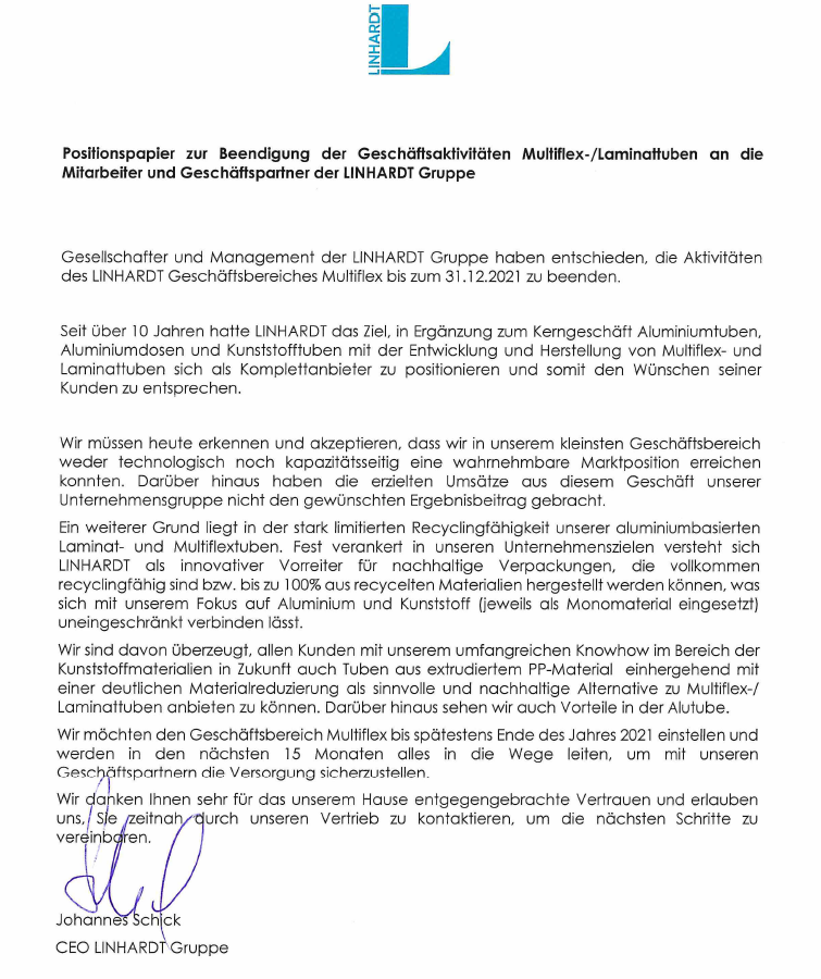 Positionspapier zur Beendigung der Geschäftsaktivitäten Multiflex-/Laminattuben