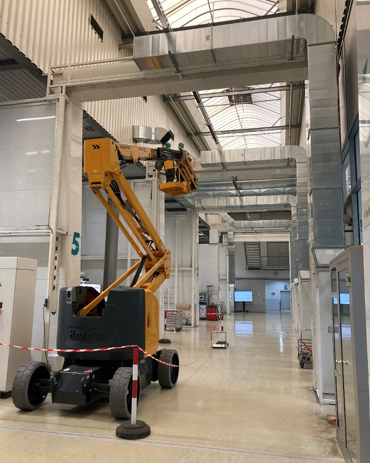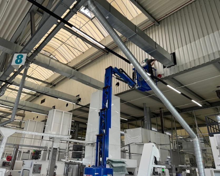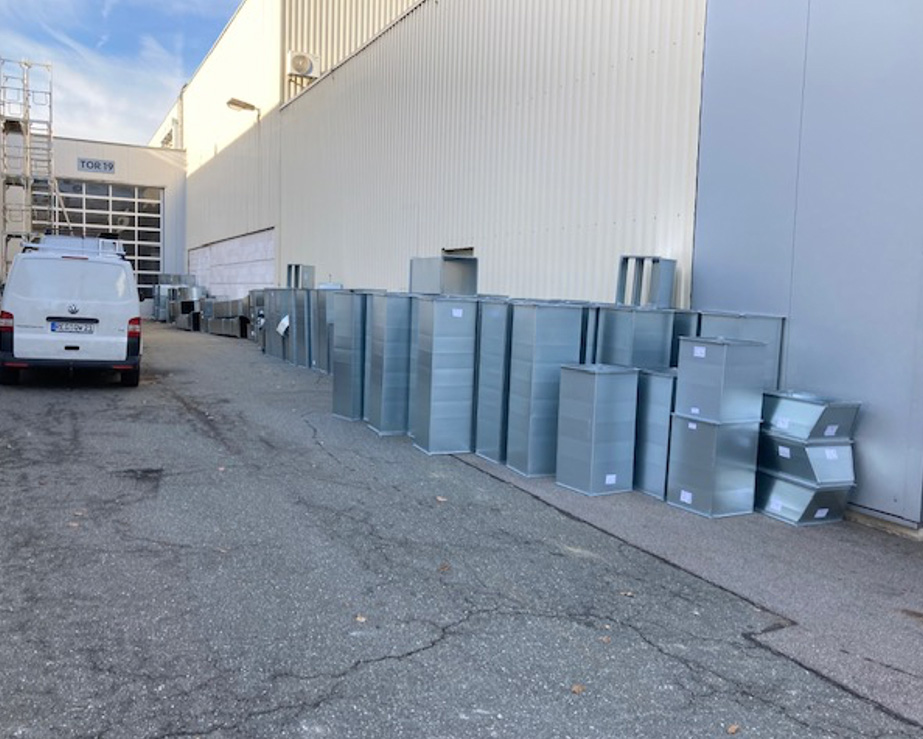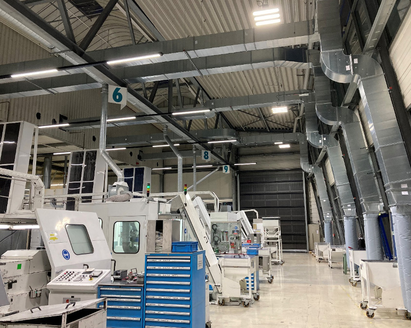Mit erheblichem Aufwand mussten hierfür viele alte Lüftungsrohre ausgebaut und neue Lüftungskanäle mit optimiertem Verlauf montiert werden. Sowohl in der Technikebene als auch im Fertigungsbereich ergibt sich ein völlig neues Erscheinungsbild mit sehr gutem Ergebnis.