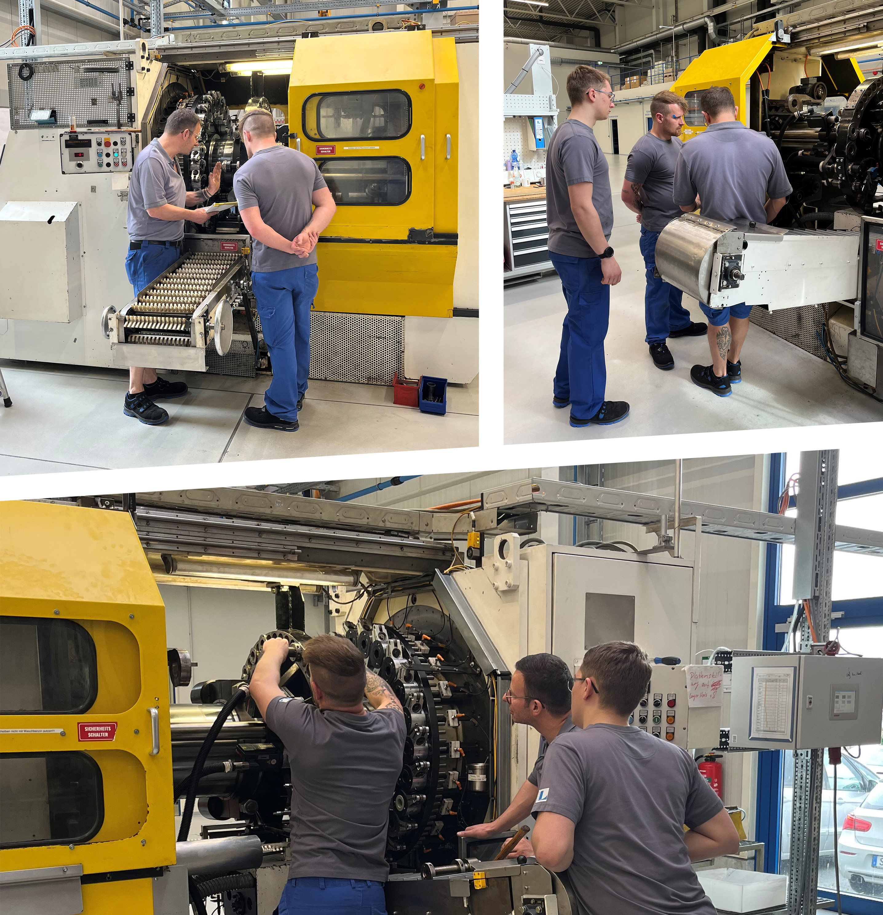 Am Freitag wurde dann erstmals die Einziehmaschine im Tec.Point zu Übungszwecken herangezogen. Einsteller Martin Kopp nutzte die frühere EZM der DL0, um seinem neuen Kollegen Thomas Kreuzer in ruhiger Umgebung dem richtigen Umgang mit der Maschine zu vermitteln und diverse Rüstvorgänge zu simulieren. Tec.Point Azubi Max Kauschinger ergriff die Möglichkeit mehr über die EZM zu lernen und schaute dem erfahrenen Einsteller dabei über die Schulter.