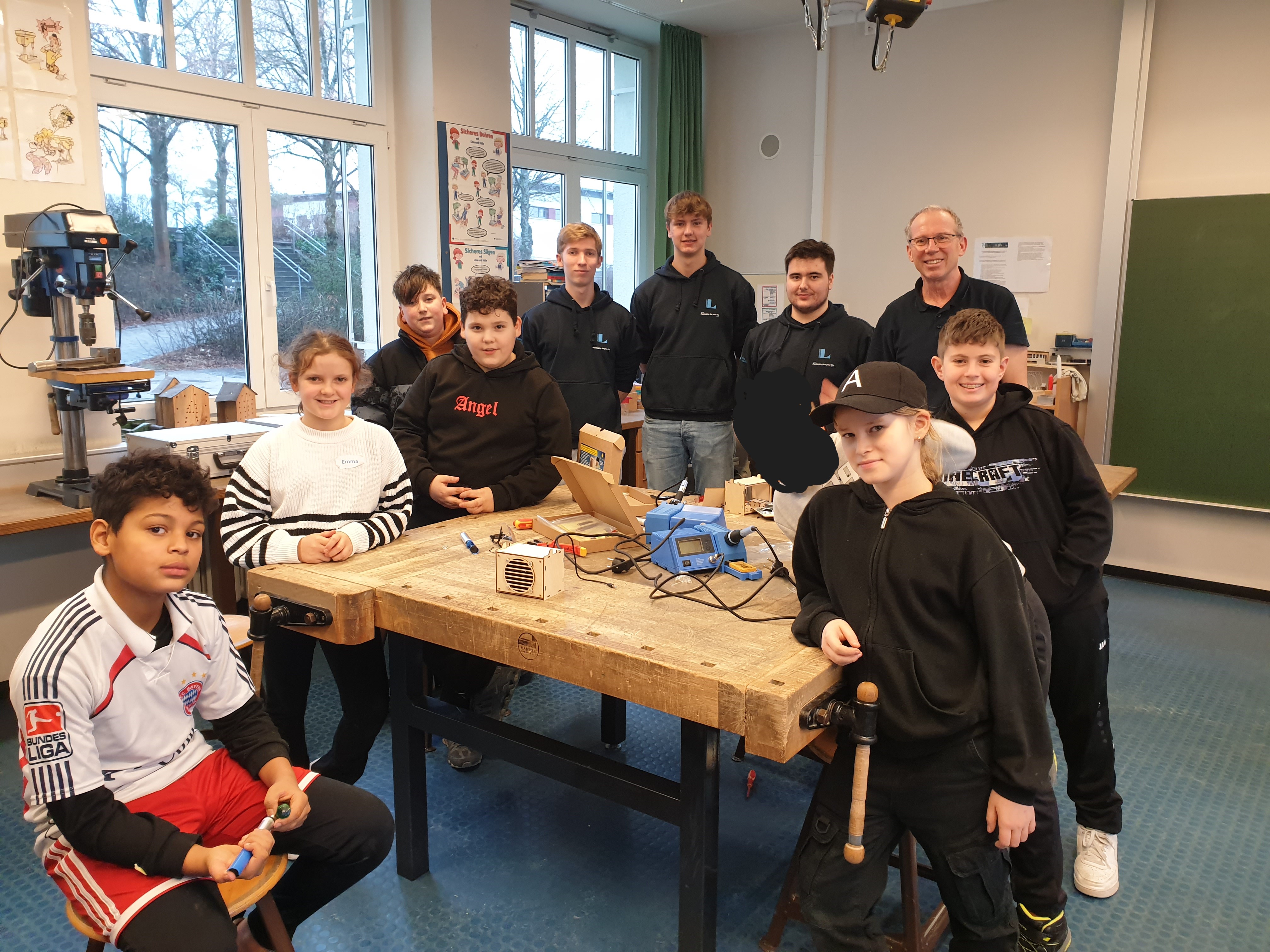 In diesem Schuljahr stieß das Projekt “Technik für Kinder” an der Mittelschule Viechtach wieder mal auf große Begeisterung. Insgesamt 22 Schülerinnen und Schüler der 5. Jahrgangsstufe waren in zwei Gruppen aktiv und widmeten sich an sechs Nachmittagen dem Schrauben und Löten. Nach den ersten Lötübungen hatten die Kinder erneut die Möglichkeit, die allseits beliebte Musikbox zu bauen, die mit dem eigenen Handy verbunden werden kann.